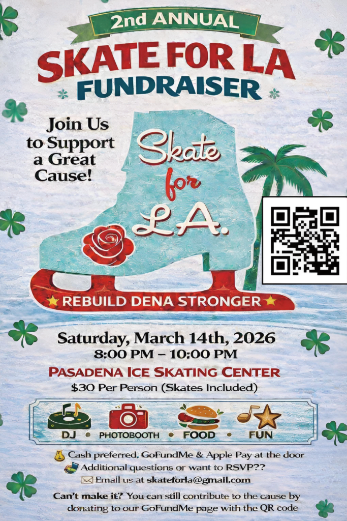 You’re invited to a special community event at the Pasadena Ice Skating Center. On March 14, 2026, “Skate for LA” will bring us together to help families recovering from the Eaton Fire.